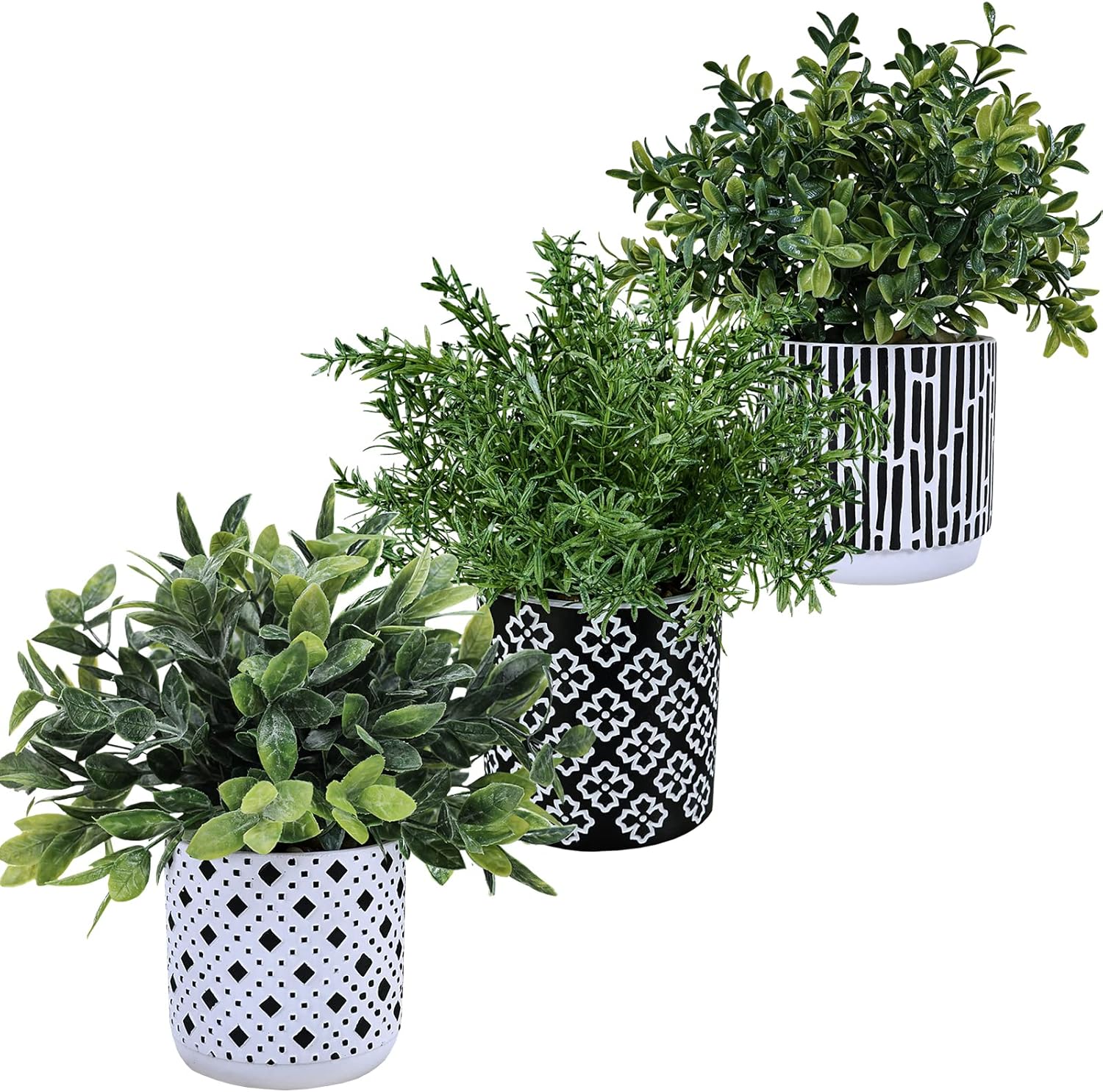- Premium Set of 3: This package includes 1 artificial potted eucalyptus, 1 faux potted rosemary, and 1 faux potted boxwood, each nestled in a unique black and white geometric concrete planter, perfect for enhancing any space with a natural and relaxing ambiance.